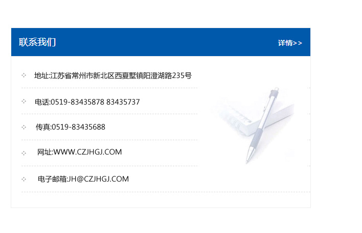 地址:常州市新北區友邦商務大廈1幢16、17層  電話:0519-85101652  傳真:0519-85112595  郵編:213022  網址:www_cz-jiayue_cn.wgjd1918.com  郵箱:xiajifengaa@163.com